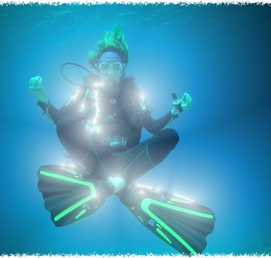 "Born to dive" plongeur entrant dans l'eau dans ses bulles.